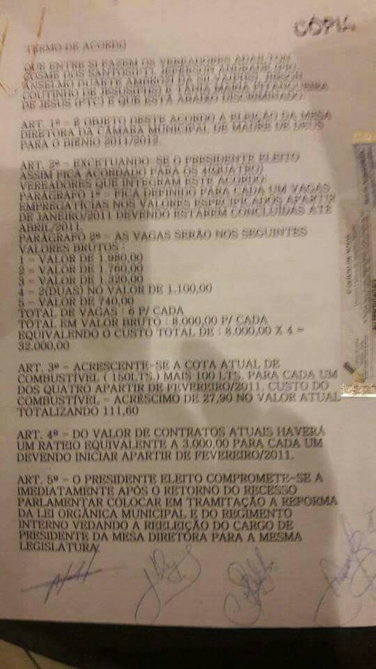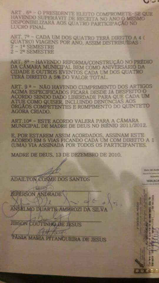 O suposto acordo, teria como “objeto a eleição para a Mesa Diretora da Câmara Municipal de Madre de Deus para o biênio 2011/2012”. No documento, com supostas assinaturas dos envolvidos e autenticação em cartório, ficariam estabelecidas ‘”para cada um vagas empregatícias” na Câmara. Os valores do cargo seriam entre R$ 740,00 e R$ 1,980,00.