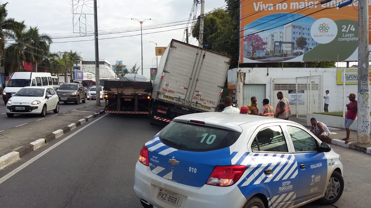 Acidente na Estrada do Coco envolvendo dois caminhões deixa via bloqueada; Settop no local
