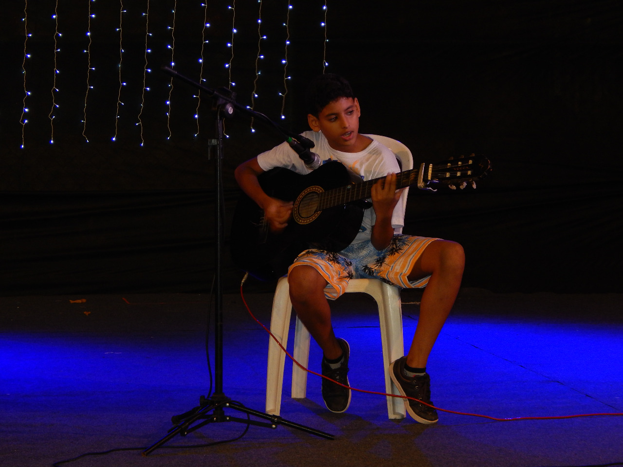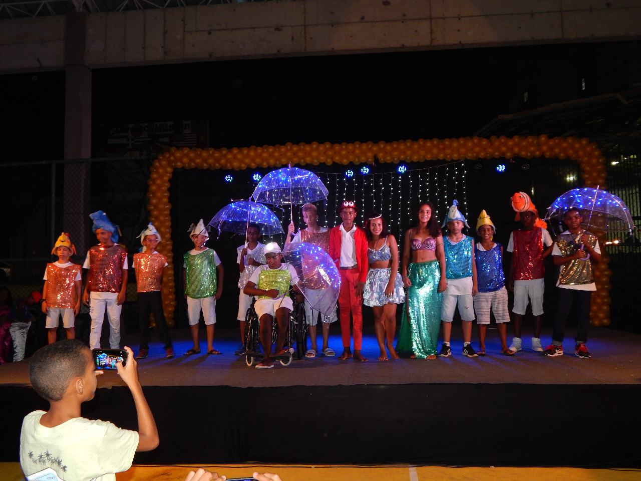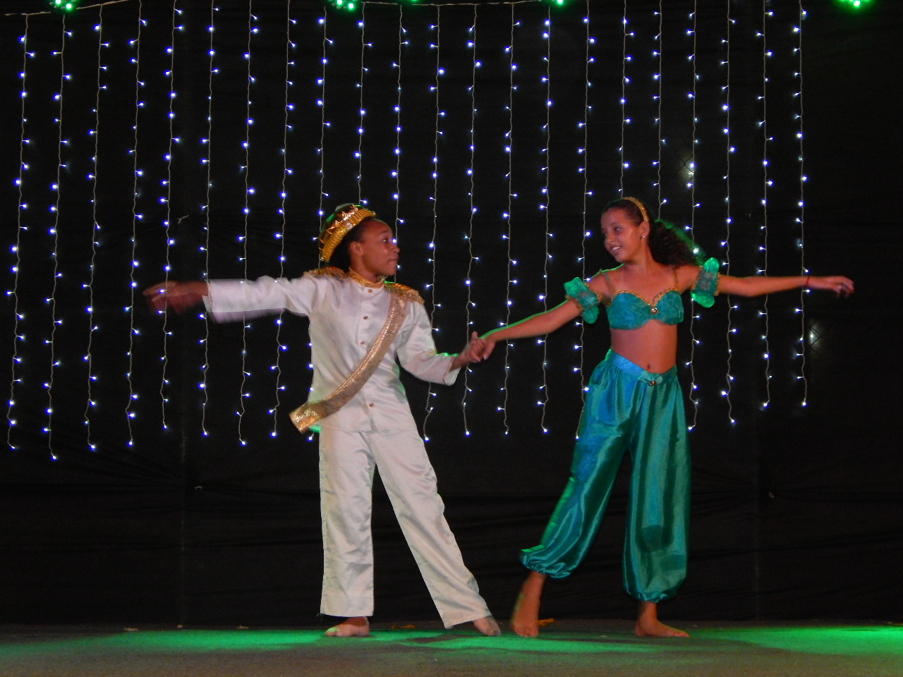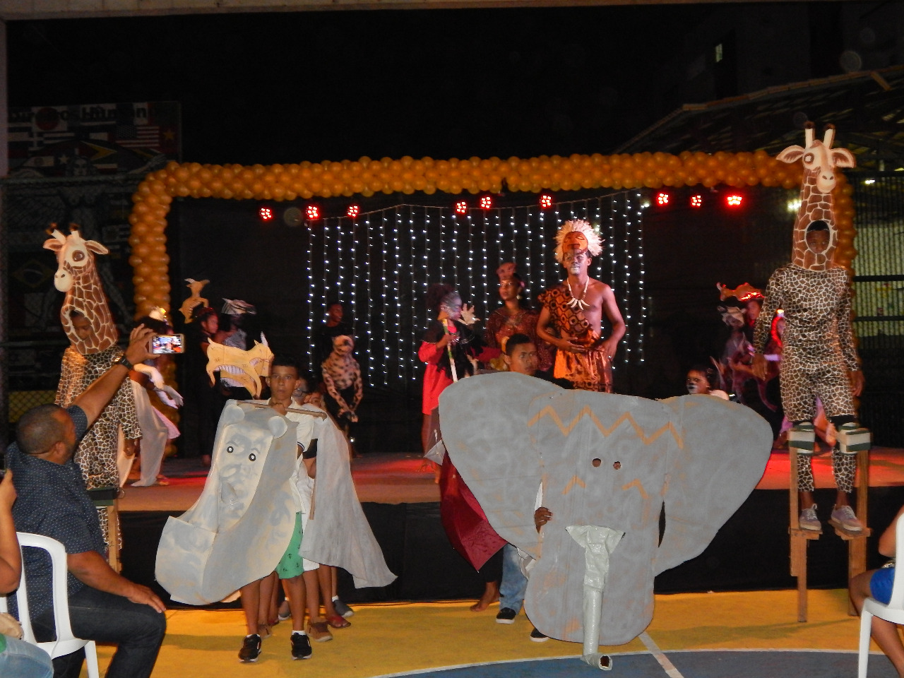 Trazendo a representação de terras africanas e o surgimento da vida, a história O Rei Leão foi a primeira a ser apresentada. Alisson Santos, 15, interpretou o Leopardo do drama estadunidense. “Com muito esforço, viemos para os ensaios e toda produção. Além de apresentar e estudar as músicas, eu gosto de futebol”, contou o aluno do 7º ano. A diversão da infância entrou no palco com crianças vestidas de Super Mario Bros, jogo eletrônico de muitas aventuras. O encanto de Ariel e seus amigos do mar, em A Pequena Sereia, fez brilhar os olhos da plateia, seguido das danças de concerto do filme Aladdin.