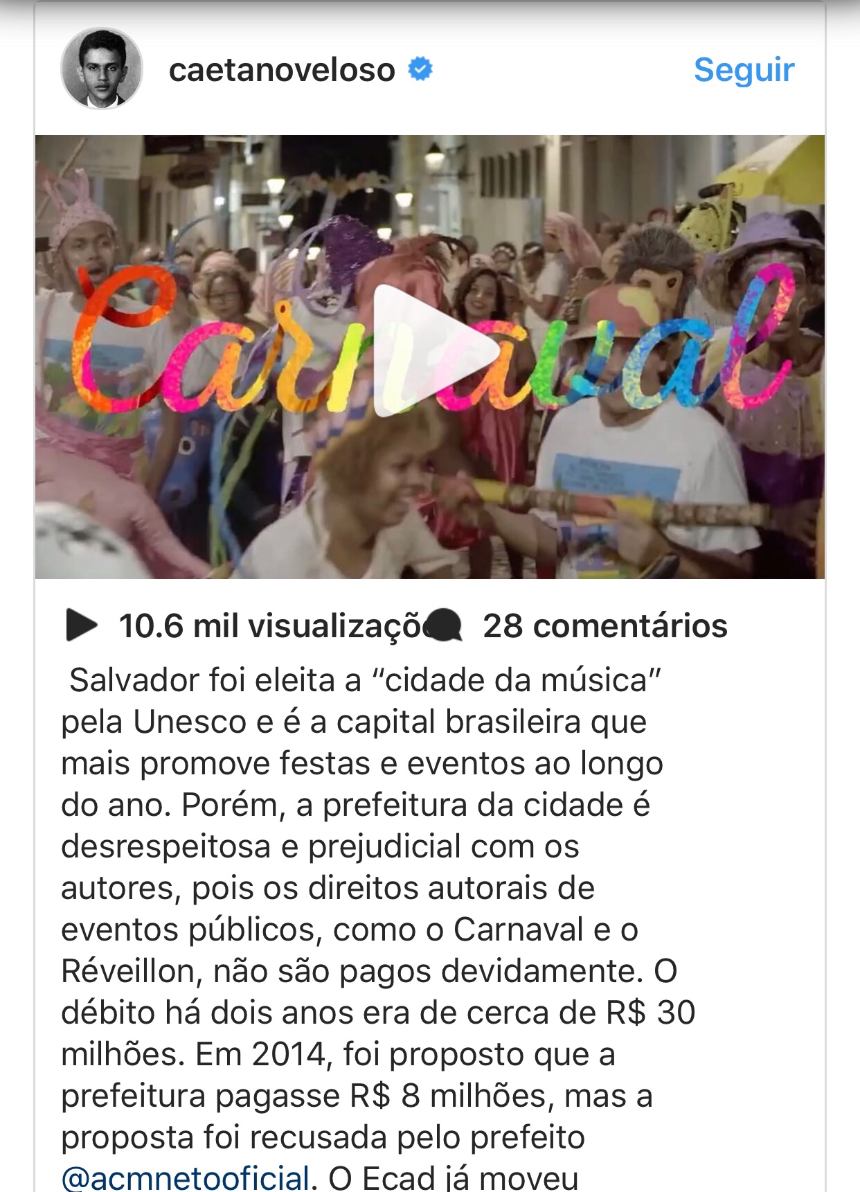 A eterna bronca de Manno Góes com a gestão municipal por causa do não pagamento de direitos autorais aos artistas que se apresentam na capital baiana agora ganhou contornos nacionais e militantes de peso. É que a campanha pelo pagamento dos direitos ao Escritório Central de Arrecadação e Distribuição (Ecad) foi abraçada por nomes como Marisa Monte, Marina Lima, Caetano Veloso, Paula Lavigne, Djavan, Xande de Pilares, Mart’nália, Lan Lan, Mauricio Mattar, Paula Burlamaqui, Diogo Nogueira, Leo Gandelman, Mosquito, Flávio Renegado e Nando Reis. “Carnaval é alegria, é dança, é música. Música. Imagina um carnaval sem música. Quando não se paga direitos autorais só quem dança é o autor. A prefeitura de Salvador não paga direitos autorais, você concorda com isso?”, este é o texto que está rodando a internet em um vídeo promocional do manifesto. “Salvador foi eleita a ‘cidade da música’ pela Unesco e é a capital brasileira que mais promove festas e eventos ao longo do ano. Porém, a prefeitura da cidade é desrespeitosa e prejudicial com os autores, pois os direitos autorais de eventos públicos, como o Carnaval e o Réveillon, não são pagos devidamente”, diz parte do texto replicado pelos artistas e compartilhado amplamente nas redes socais, segundo o qual o débito da prefeitura há dois anos já somava cerca de R$ 30 milhões. “Em 2014, foi proposto que a prefeitura pagasse R$ 8 milhões, mas a proposta foi recusada pelo prefeito ACM Neto”, destacam nominalmente o gestor municipal. “O Ecad já moveu inúmeras ações e continua acionando a cidade e tentando um diálogo. Porém, a prefeitura não se dispõe a negociar. Precisamos nos mobilizar para enfrentar esse absurdo”, convoca o manifesto.