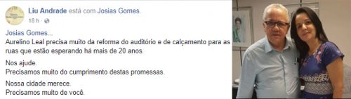 A prefeita de Aurelino Leal, Liu Andrade (PP) usou a rede social para fazer cobranças ao secretário de relações institucionais da Bahia e deputado federal licenciado, Josias Gomes (PT). Em uma das publicações Liu Andrade enalteceu a esperança de Josias realizar a reforma do Auditório Municipal já que este foi um dos seus compromissos quando se fez presente na inauguração da ala de fisioterapia do hospital geral de Aurelino Leal. Ao que tudo indica, que Josias Gomes cumprirá com sua promessa antes do período eleitoral.