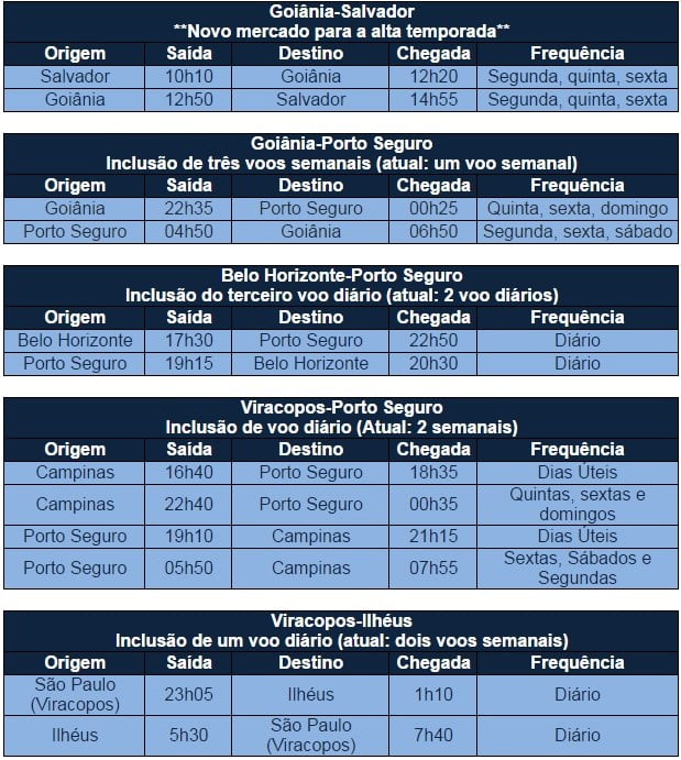 Durante a alta temporada de julho, a companhia aérea Azul vai alocar mais de 150 voos extra cuja origem ou destino são cidades da Bahia. Os traslados irão ou partirão de Campinas, Belo Horizonte, Goiânia e irão para Salvador, Porto Seguro, Ilhéus e Valença.