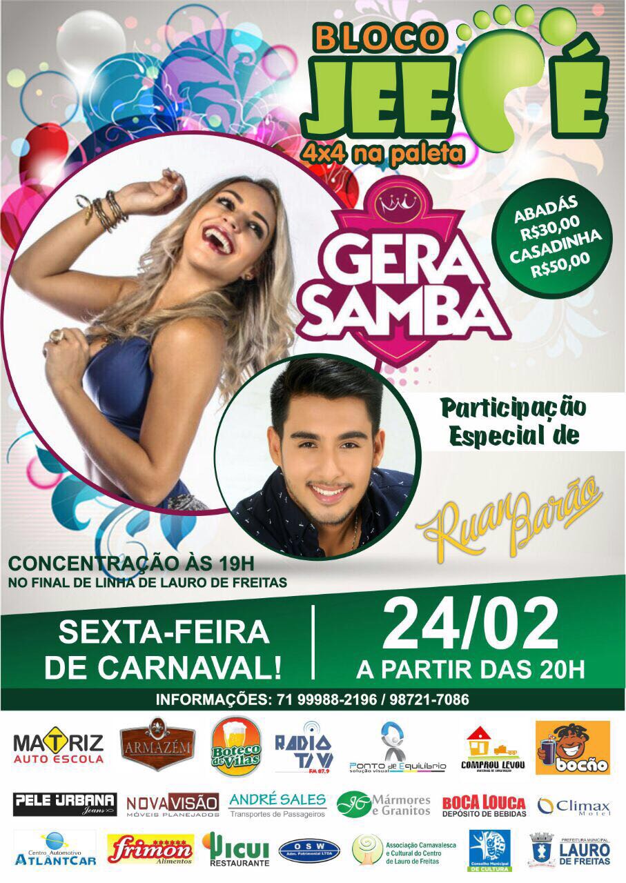 O bloco Jeepé, do grande Rangel estará mais uma vez com toda força, na sexta-feira de Carnaval em Lauro de Freitas com Gera Samba e Ruan Barão. Duas grandes atrações, que levará milhares de foliões às ruas da cidade atras do Jeepé.