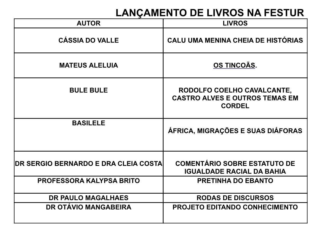 A FESTUR – Festa Turística Étnica e Cultural de Lauro de Freitas, acontece de 19 a 21 de janeiro com uma programação extensa e diversificada que traz desde cortejo étnico cultura com entidades locais até uma cavalgada, passando por espetáculos teatrais e circenses, debates, feiras de artesanato e shows. Uma extensão da Univerão (Universidade de Verão), que traz um leque de experiências oferecido por 11 universidades, institutos e entidades culturais. O diretor de Turismo, Joílson Lopez é o grande idealizador do Festur.