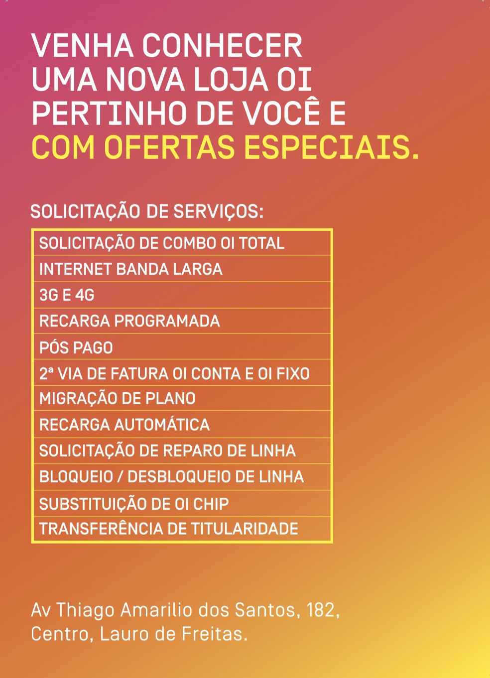 Comodidade, praticidade, atendimento de qualidade e serviços completos para a população, agora você pode encontrar na Loja da Oi que chegou em Lauro de Freitas e fica no coração da cidade, bem pertinho de você!