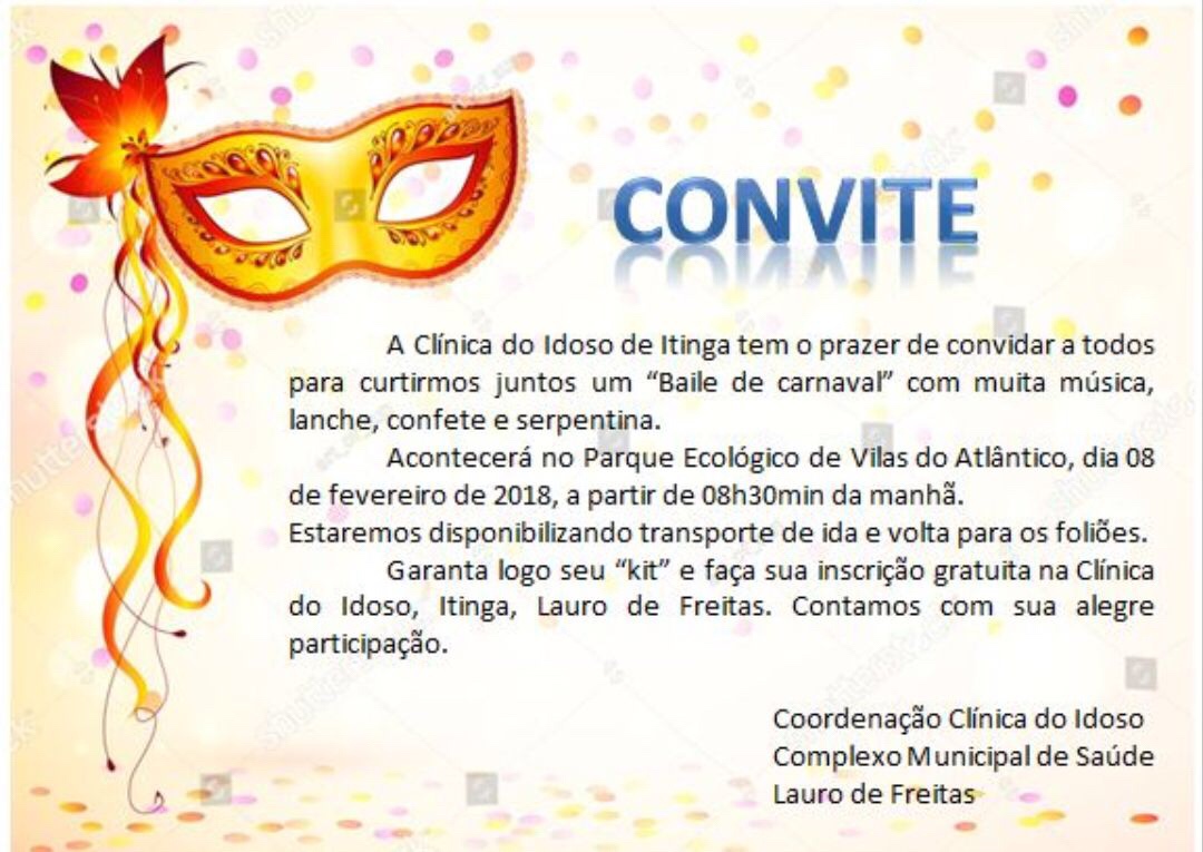 Haverá transporte de ida e volta para os foliões. A inscrição para participar do baile é gratuita. Maiores informações poderão ser obtidas através da Coordenação da Clínica que fica no Complexo de Saúde de Itinga.