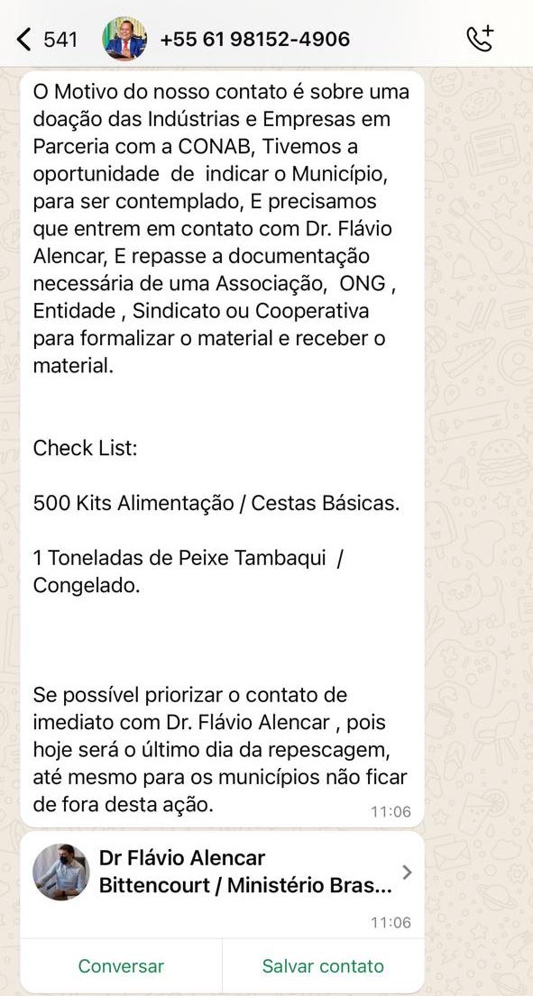 Para ter acesso ao suposto benefício, a vítima é orientada a entrar em contato com outra pessoa, identificada pelo golpista como Dr. Flávio Alencar, apontada pelo criminoso como representante do Governo Federal. A doação de 500 kits de cesta básica e 1 tonelada de peixe Tambaqui congelado, prometida na mensagem, é falsa.