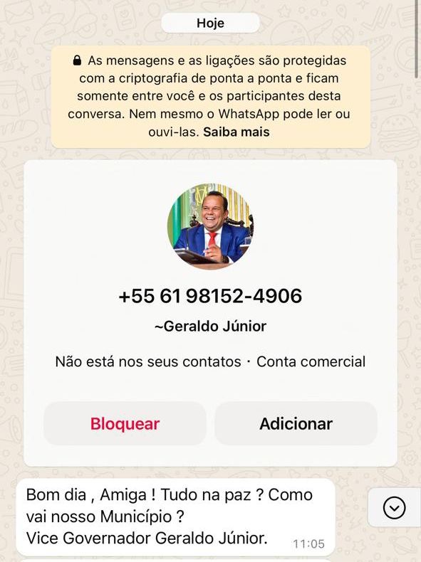 A pessoa que se passou por Geraldo Júnior utiliza um DDD de Brasília, (61) 98152-4906, número que nunca pertenceu ao vice-governador. O caso foi identificado neste sábado (11) e já foi denunciado à Polícia Civil para investigação.