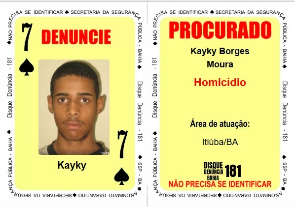 Na carta “7 de Espadas” foi incluído Kayky Borges Moura, procurado por dois mandados de prisão relacionados a homicídios no município de Itiúba, no interior da Bahia.