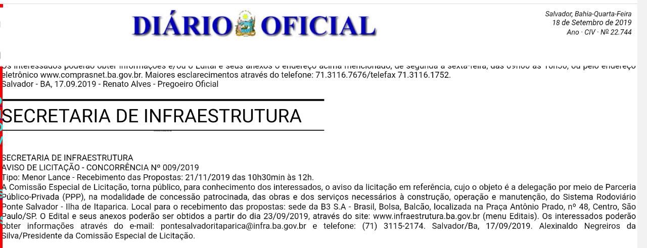 Está publicado no Diário Oficial do Estado (DOE) desta quarta-feira (18) o aviso de licitação da Ponte Salvador – Itaparica, conforme foi antecipado pelo governador Rui Costa durante o #PapoCorreria, realizado na noite de terça-feira (17). De acordo com a publicação – disponível na área do DOE destinada exclusivamente a licitações – as obras e os serviços de operação e manutenção deste novo sistema rodoviário vão ser executados por meio de Parceria Público-Privada (PPP), na modalidade de concessão patrocinada.
