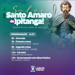 A missa rezada pelo padre Anastácio Gilberto encerrará as festividades, às 17h. Toda a programação será transmitida pelo canal da paróquia no Youtube. “Santo Amaro de Ipitanga nos ensina a obediência e a essência do servir. Seus feitos devem ser lembrados e seguidos”, falou.