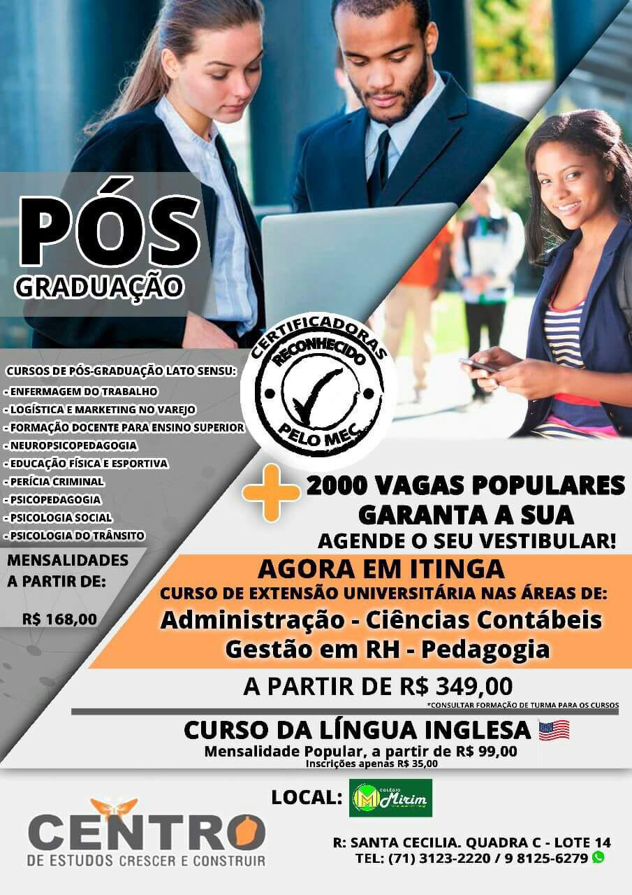 Nesta sexta-feira (12) em Itinga, a apresentação do Centro de Capacitação, Qualificação e Extensão Universitária “Crescer e Construir” instalado recentemente no Colégio Mirim. Na oportunidade foram anunciadas pela direção pedagógica mais de 2.000 vagas populares para diversas modalidades educacionais, entre elas: Cursos De Extensão Universitária; Cursos Técnicos; Cursos Profissionalizantes; Pós-Graduação e Cursos Livres.