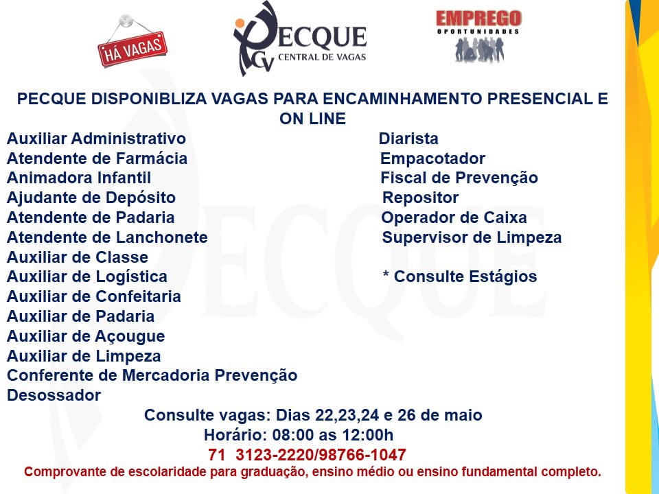 O Pólo de Educação, Capacitação, Qualificação e Empregabilidade (PECQUE) estará disponibilizando entre os dias (22, 23, 24 e 26/05), das 8h às 12h, vagas de emprego para encaminhamento presencial e online. O PECQUE fica em Itinga na Rua Araci Grubide, QD G / LT 2 – 1º andar – Largo do Caranguejo. Telefones: (71) 3123-2220 / 98766-1047