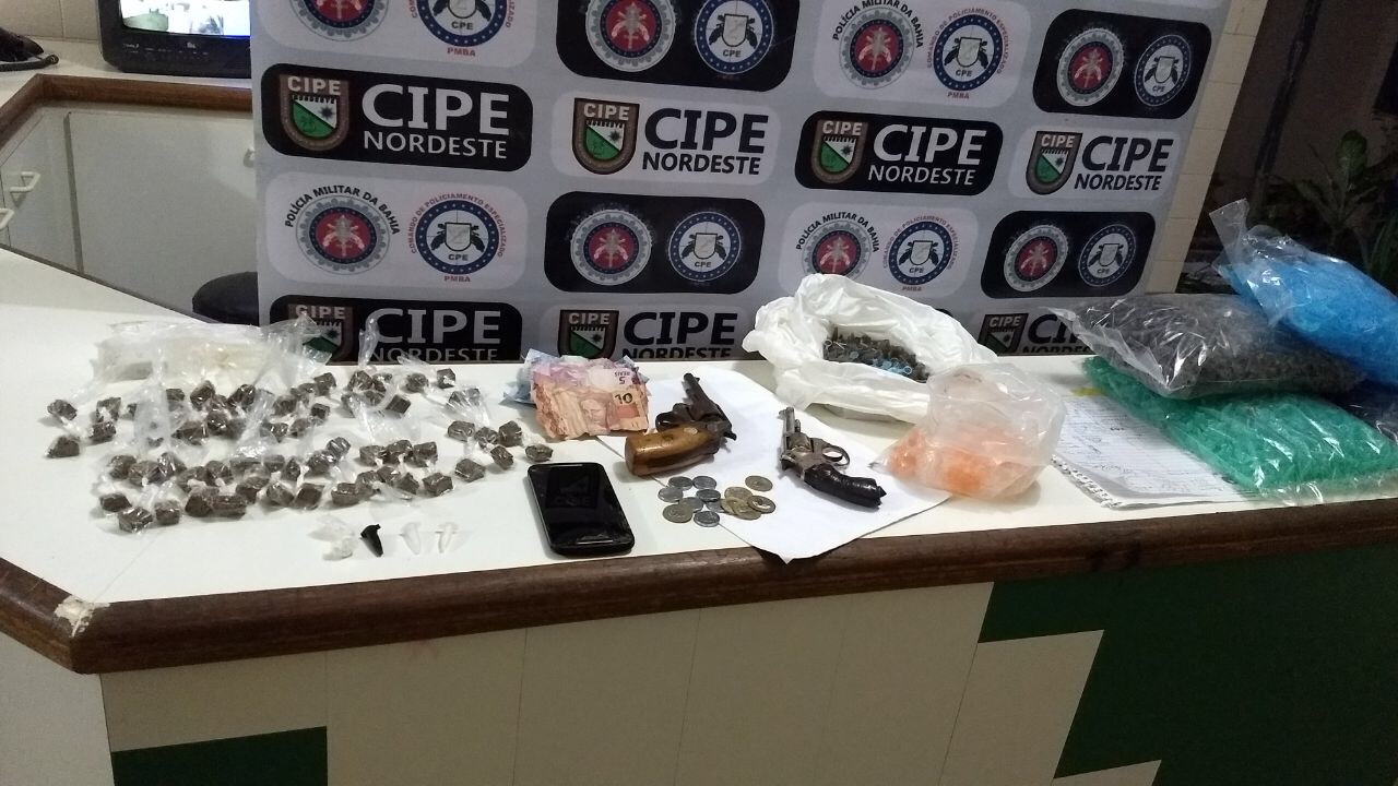 Paulino Jesus da Silva e seu filho Pablo Rodrigo Jesus da Silva fazem parte de uma quadrilha responsável por tráfico de drogas e assaltos na região. Bruno Jesus Santana, o ‘Bruxinha’, também foi preso em flagrante e na casa utilizada por eles os militares apreenderam 64 porções de maconha e cocaína, além de 5.000 pinos para embalar drogas.