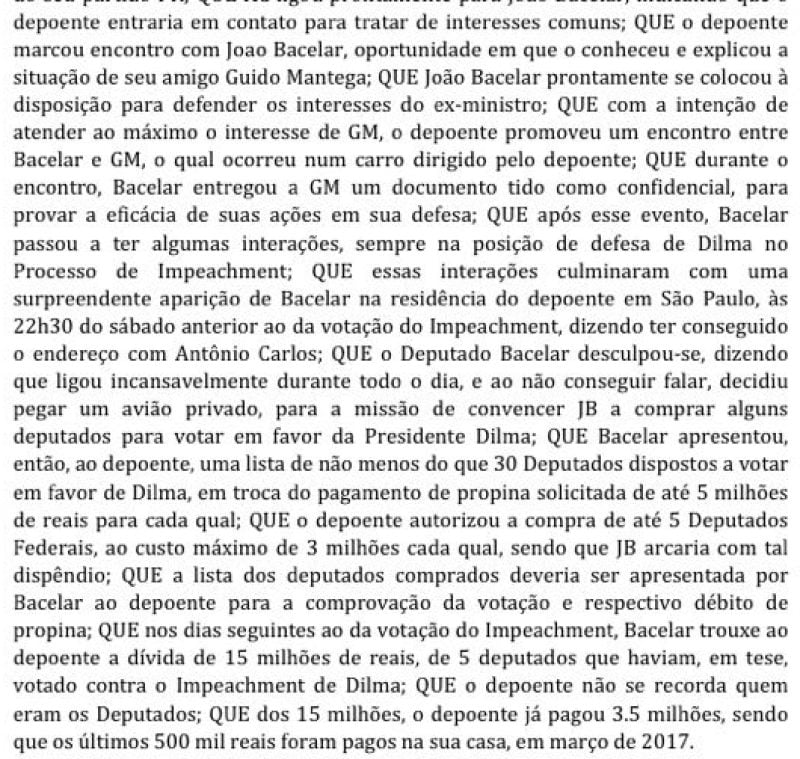Segundo o site O Antagonista, o delator contou que Bacelar apareceu em sua casa às 22h30 do sábado anterior ao da votação do impeachment, com a missão de convencer o empresário a “comprar alguns deputados para votar em favor da presidente Dilma”.