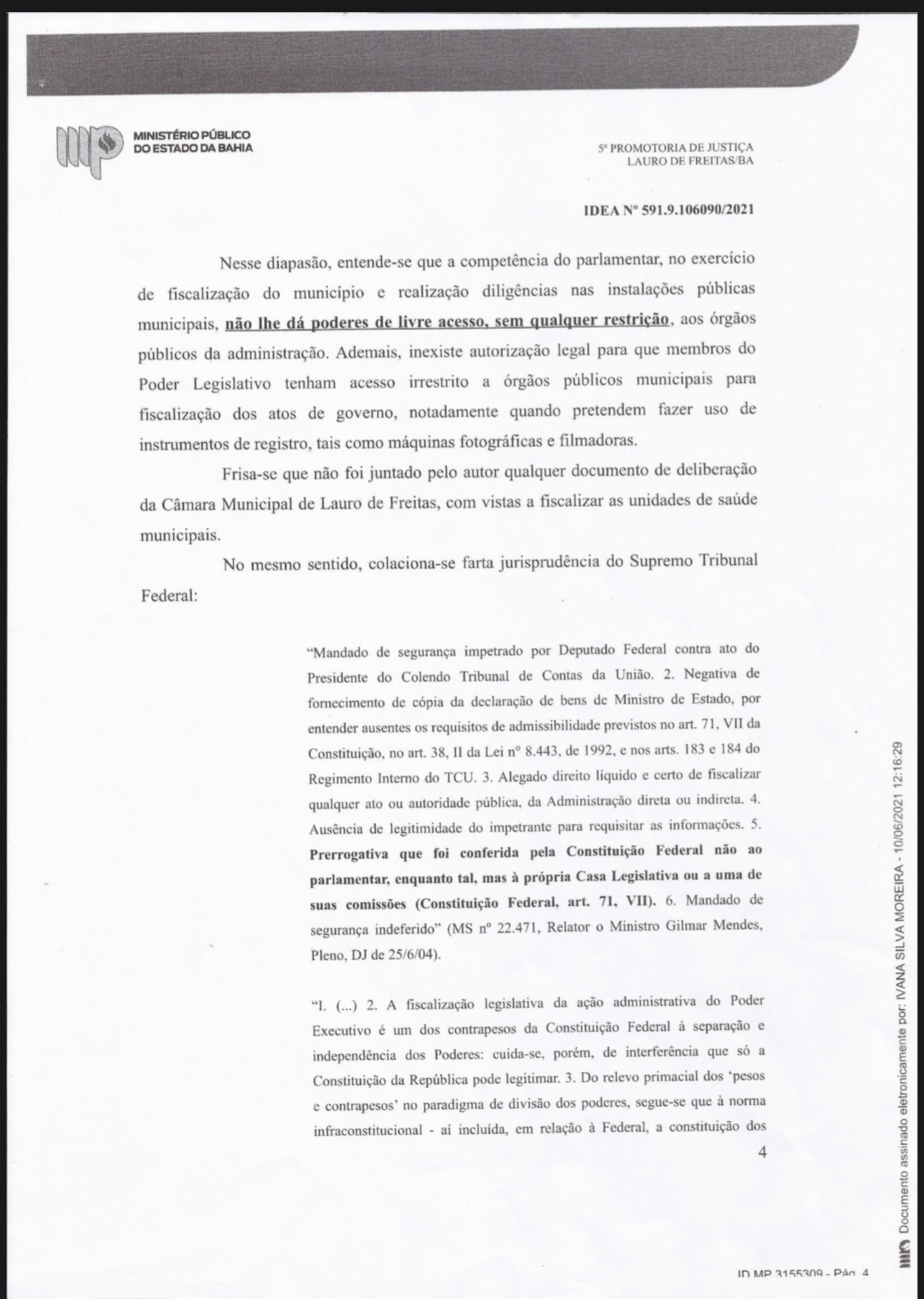 “Nesse diapasão, entende-se que a competência do parlamentar, no exercício de fiscalização do município e realização de diligências nas instalações públicas municipais, não lhe dá poderes de livre acesso, sem qualquer restrição, aos órgãos públicos da administração”, informa o documento.