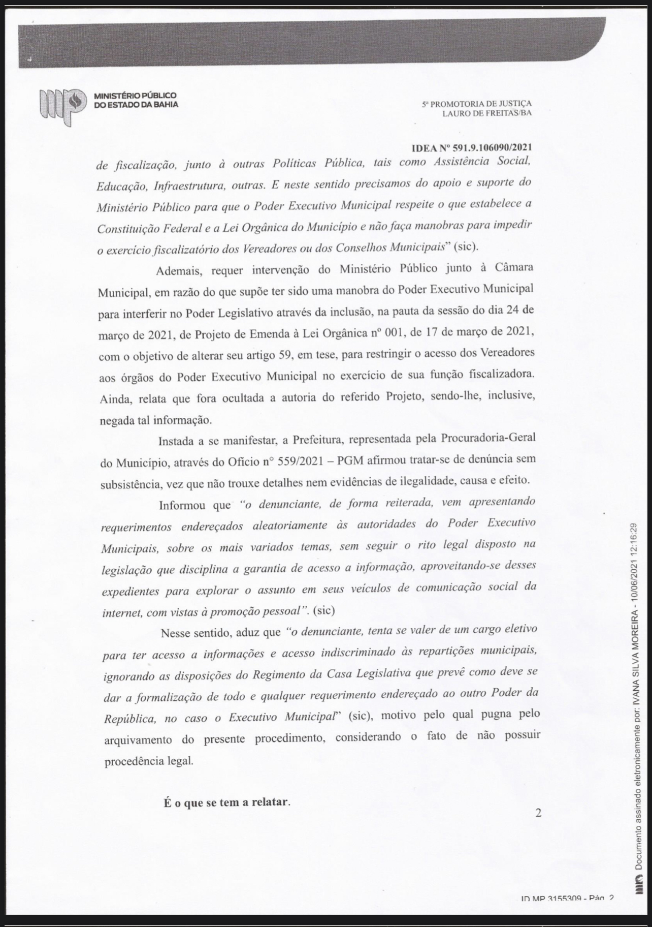 Por falta de fundamento jurídico, MP-BA arquiva pedido de vereador para realizar diligências em órgãos públicos de Lauro de Freitas