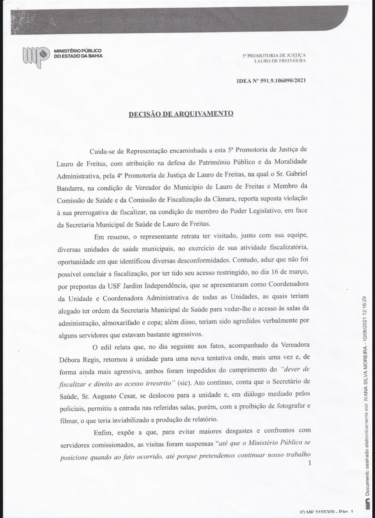 O Ministério Público da Bahia determinou, por falta de fundamento jurídico, o arquivamento do pedido do vereador Gabriel Bandarra, vulgo Tenóbio, da Câmara Municipal de Lauro de Freitas, para ter acesso irrestrito em repartições públicas a pretexto de “fiscalizar atos do Poder Executivo” local.