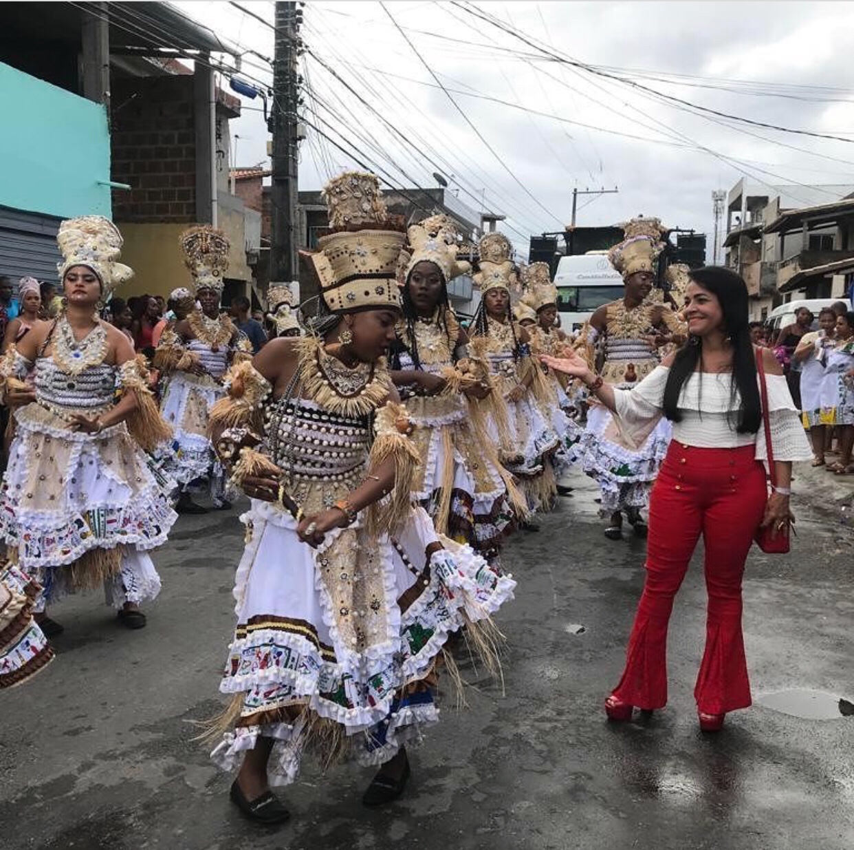 “Hoje foi dia de acompanhar o desfile do Bankoma aqui em Lauro de Freitas. Muita cultura e tradição passando em Portão. Lindo demais!”, relatou a prefeita.