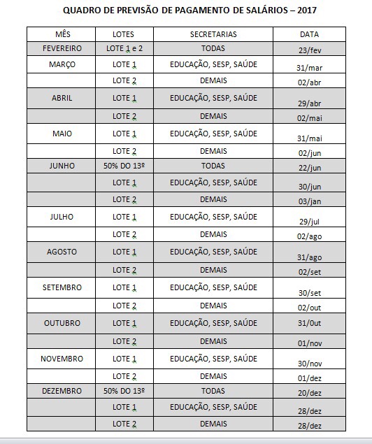 A Prefeitura de Lauro de Freitas, através da Secretaria Municipal de Administração (SECAD) e da Secretaria Municipal da Fazenda (SEFAZ), demonstrando o compromisso com os servidores públicos e com a comunidade, divulga o calendário anual de pagamento de salários e 13º.