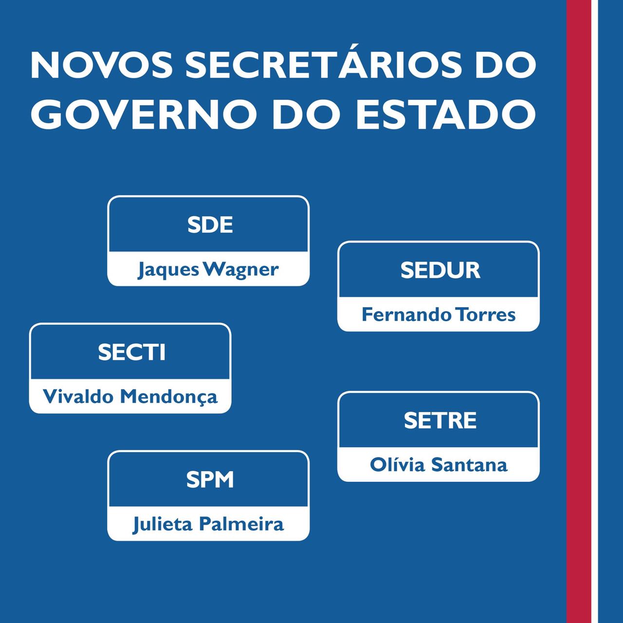 Vivaldo Mendonça assume a Secti; Fernando Torres assume a Sedur; o ex-governador Jaques Wagner comandará a Secretaria de Desenvolvimento Econômico, substituindo Jorge Hereda.