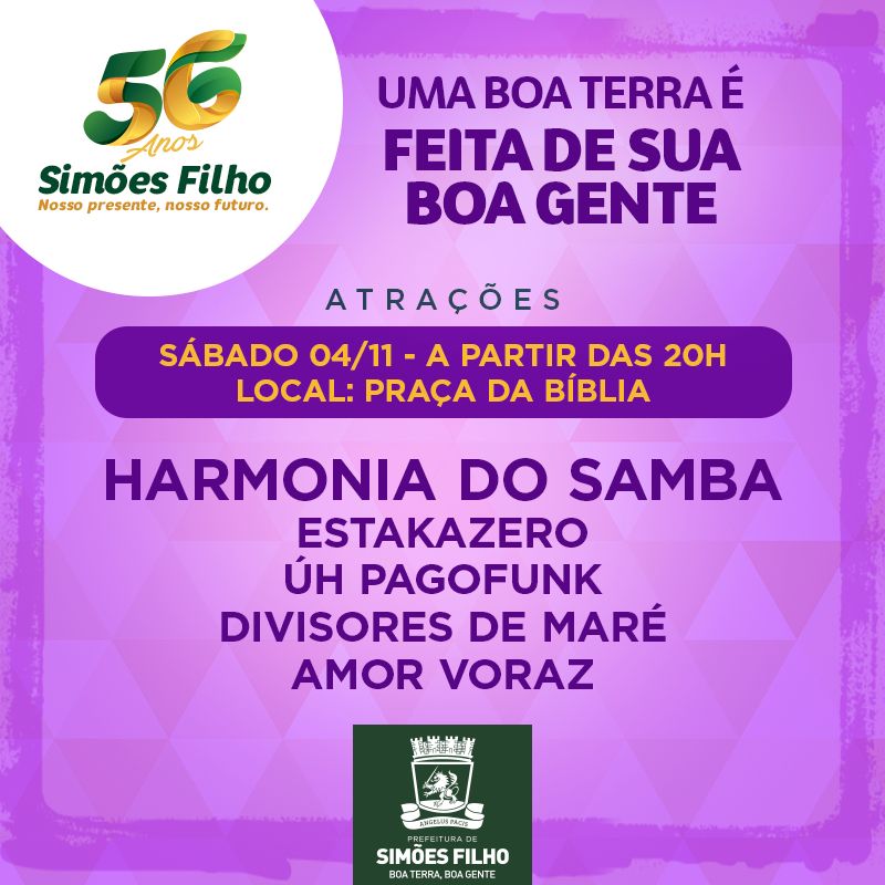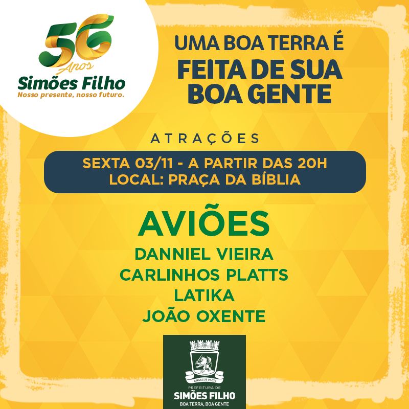 Simões Filho, cidade da Região Metropolitana de Salvador, estará completando 56 anos de emancipação política no dia 07 de novembro. Para comemorar, a Prefeitura Municipal preparou uma programação especial, que conta com inaugurações e apresentações de grandes nomes da música. As atrações se apresentarão nos dias 3 e 4 na Praça da Bíblia, Centro.