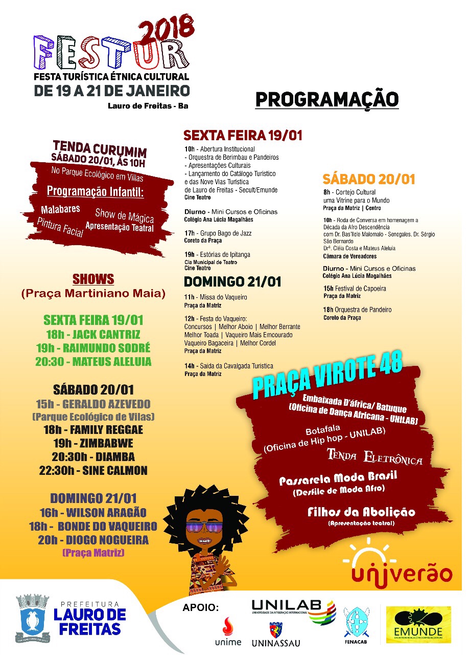 Na Reunião desta terça feira, a UNILAB será convidada, dada esta grande importância, para a Mesa de Abertura da FESTUR – FESTA ÉTNICA, TURÍSTICA E CULTURAL DE LAURO DE FREITAS, nesta mesa ela vai falar da sua participação no evento e uma síntese do seu projeto na Bahia e no Brasil.