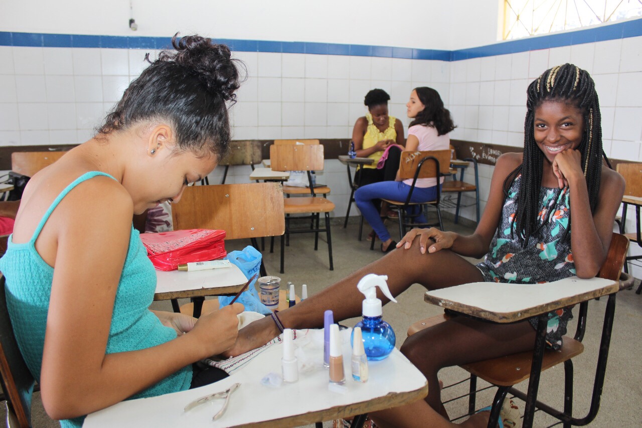 Em frente ao IFBA, o Colégio Dois de Julho abriga os cursos de manicure, toy arte em tecido, estética afro e oficina de turbante entre outros. Ministrado pela instrutora de embelezamento de mãos e pés, Carine Oliveira, o curso de manicure permite à turma o aprendizado teórico sobre anatomia, patologia e fisiologia das unhas. Na parte prática, as alunas puderam exercitar o processo de cutilagem, escarnação, corte e pintura.