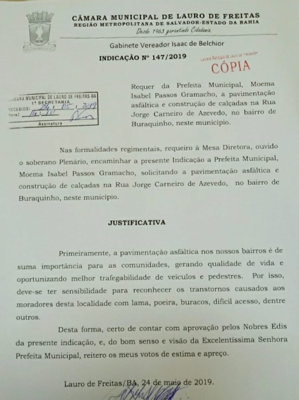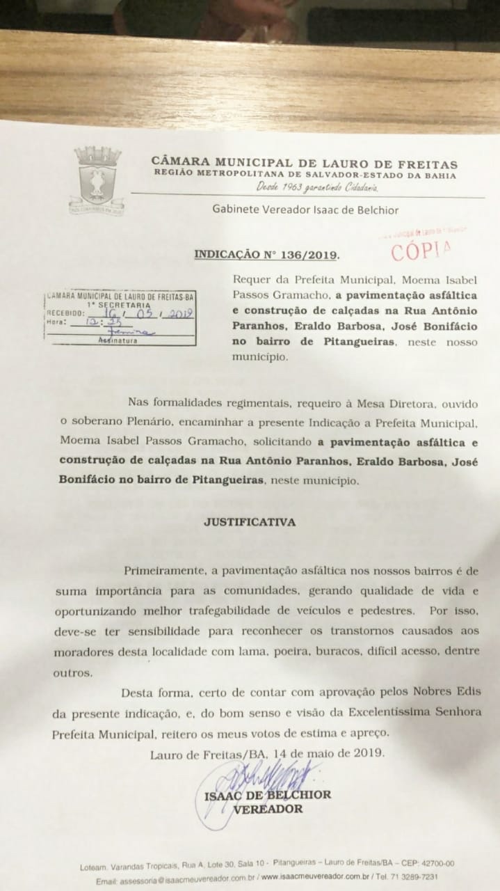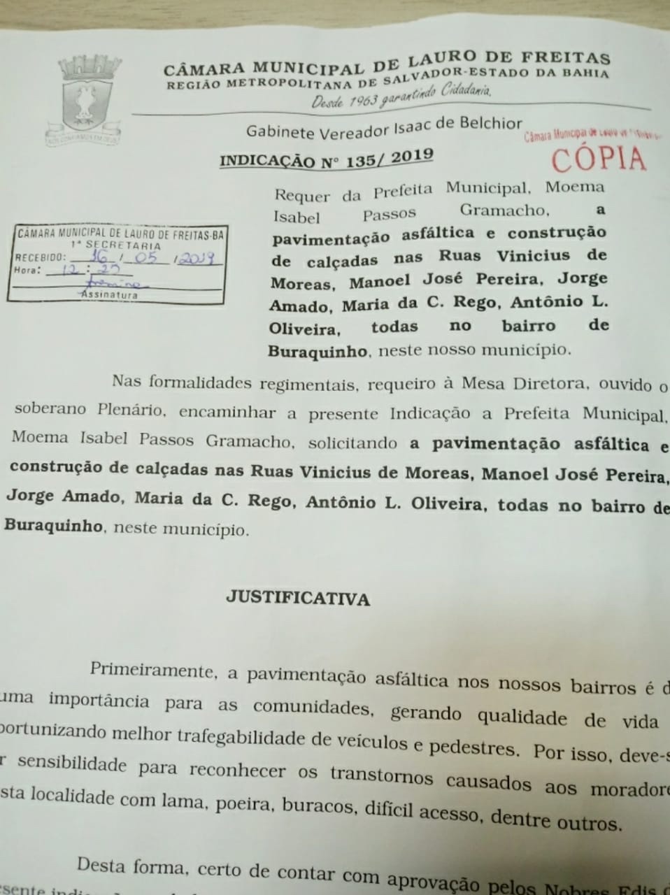 Atendendo pedidos de moradores, o vereador Isaac de Belchior solicitou, nas sessões ordinárias das últimas semanas do mês de maio, na Câmara Municipal de Lauro de Freitas, a pavimentação asfáltica e a construção de calçadas nas ruas de Buraquinho e Pitangueiras.